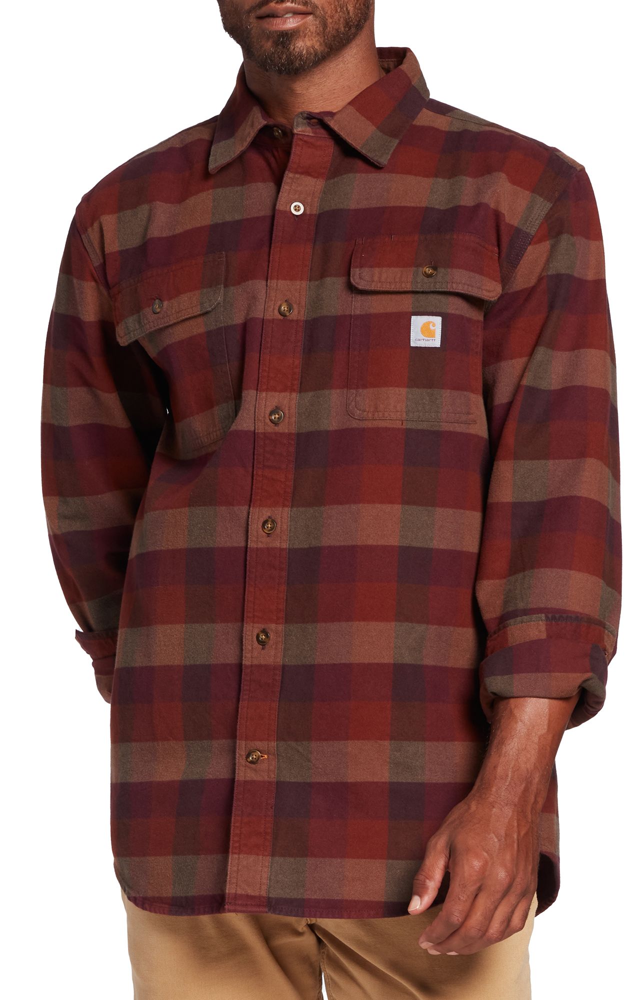 Carhartt Men's Loose Fit Heavyweight Flannel Long-Sleeve Plaid Shirt, Mineral Red