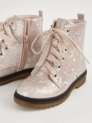Pink Glitter Heart Lace Up Boots | Kids